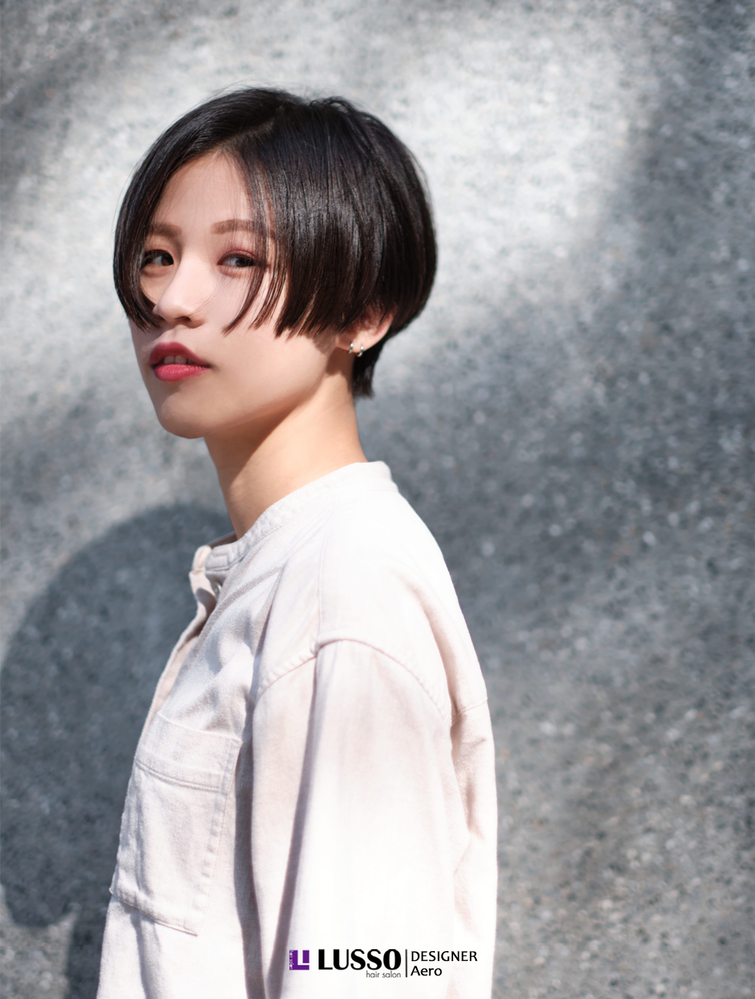 日雜的高層次男孩短髮,碎瀏海呈現柔美的俏皮感,搭配使用造型髮乳創造出的微濕光澤,配上一件洋裝就能優雅的出門