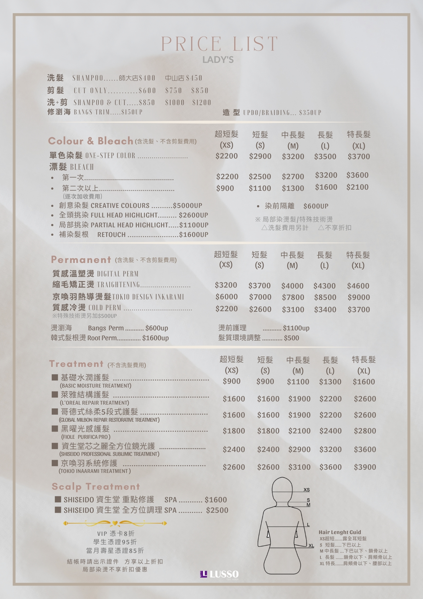 台北剪髮染髮燙髮價位 LUSSO 染燙價格依髮長收費,含洗髮 不含剪髮費用,剪髮收費視設計師不同 單剪髮(不含洗髮)$500 、 $700 、 $850。歡迎加 設計師好友 諮詢。