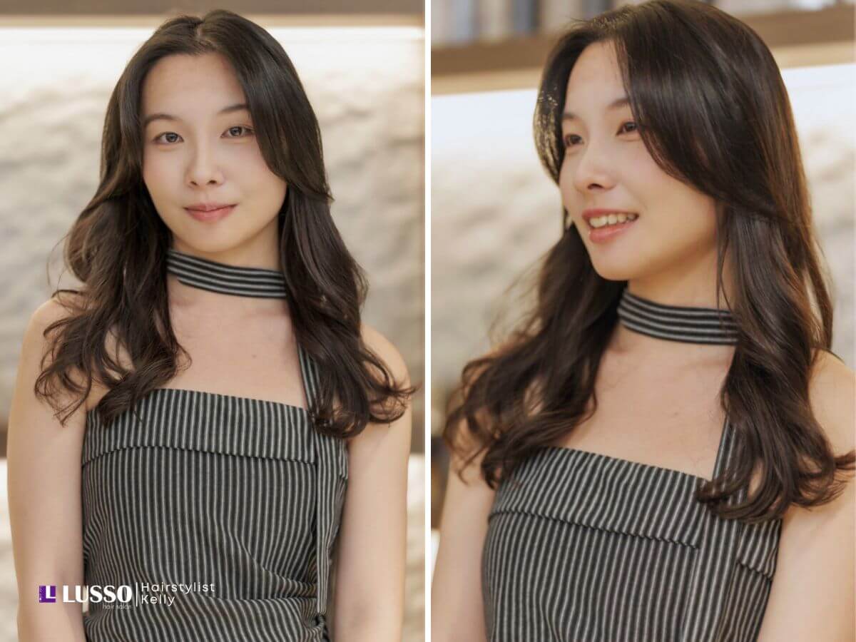 完美的八字S型長瀏海,長度落在顴骨至下巴線條之間,透過向外翻捲的弧度,溫柔地修飾了顴骨和臉頰的線條,創造出視覺上的小臉效果。同時,燙髮也兼顧了髮根的支撐力,維持頭頂自然的蓬鬆感,解決了亞洲人頭型扁塌的困擾,讓整體輪廓更顯立體、優雅且浪漫的韓系氣質。